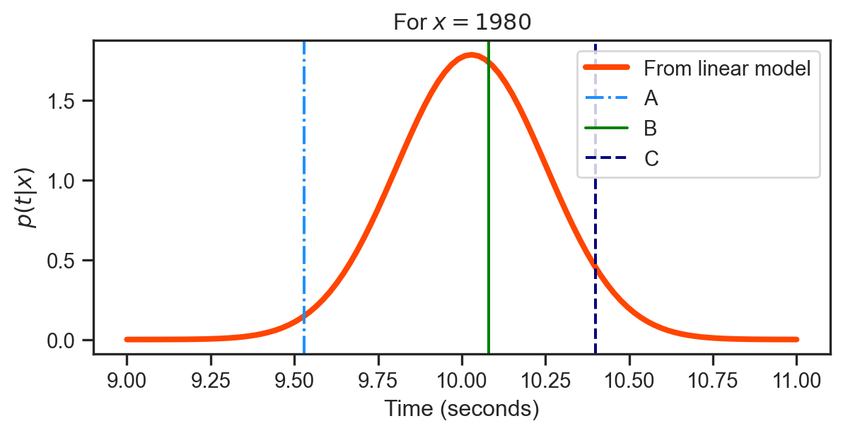 import numpy as npimport matplotlib.pyplot as pltimport pandas as pdfrom scipy.stats import multivariate_normal# Get the data df = pd.read_csv('notebooks/data/data100m.csv')df.columns=['Year', 'Time']N = df.shape[0]max_year, min_year = df['Year'].values.max() , df['Year'].values.min()x = (df['Year'].values.reshape(N,1) - min_year)/(max_year - min_year)t = df['Time'].values.reshape(N,1)X_func =lambda u : np.hstack([np.ones((u.shape[0],1)), u])X = X_func(x)w_hat = np.linalg.inv(X.T @ X) @ X.T @ t# Specific year!year_j =1980X_j = X_func(np.array( [ (year_j - min_year) / (max_year - min_year) ] ).reshape(1,1) )time_j =float(X_j @ w_hat)T_1980 = multivariate_normal(time_j, 0.05)ti = np.linspace(9, 11, 100)pt_x = T_1980.pdf(ti)fig = plt.figure(figsize=(7,3))plt.plot(ti, pt_x, '-', color='orangered', lw=3, label='From linear model')plt.axvline(9.53, linestyle='-.', color='dodgerblue', label='A')plt.axvline(10.08, linestyle='-', color='green', label='B')plt.axvline(10.40, linestyle='--', color='navy', label='C')plt.xlabel('Time (seconds)')plt.ylabel(r'$p \left( t | x \right)$')plt.title(r'For $x=1980$')plt.legend()plt.close()