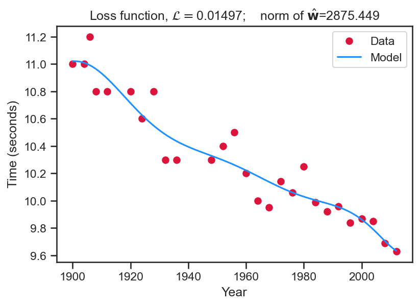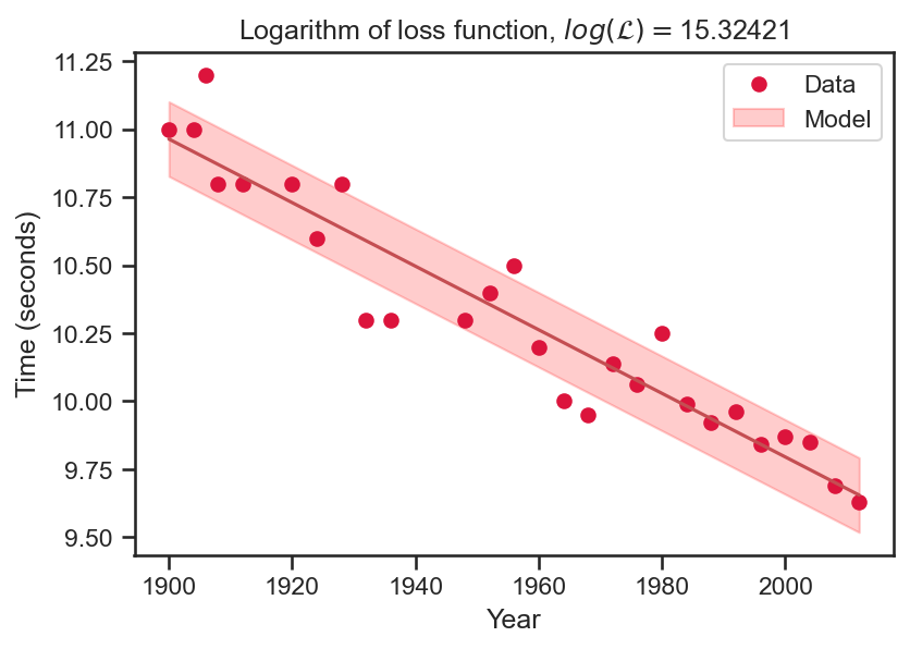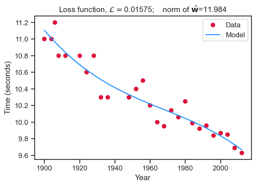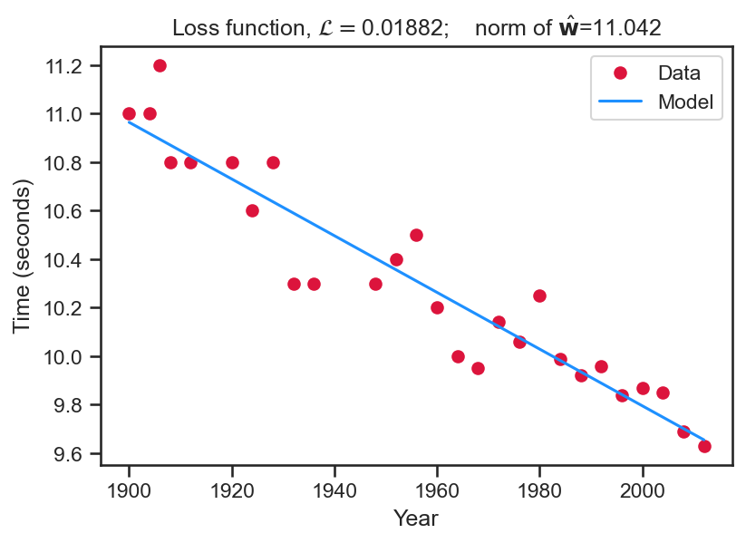 Consider the data shown in the plot below. It shows the winning times for the men’s 100 meter race at the Summer Olympics for many years.