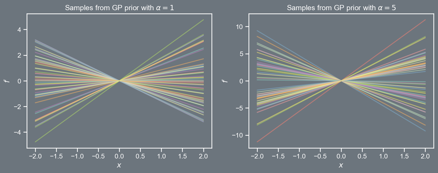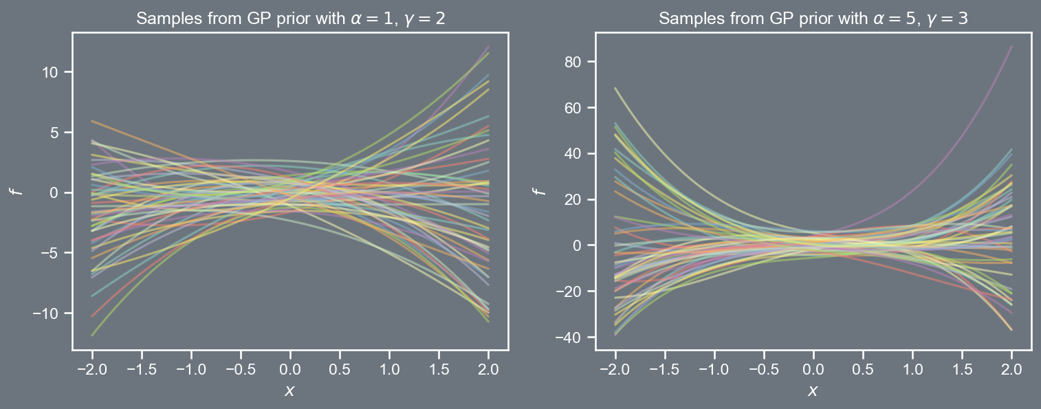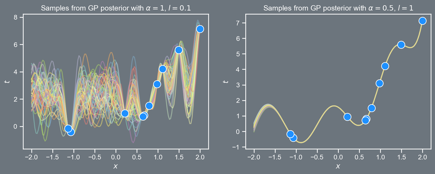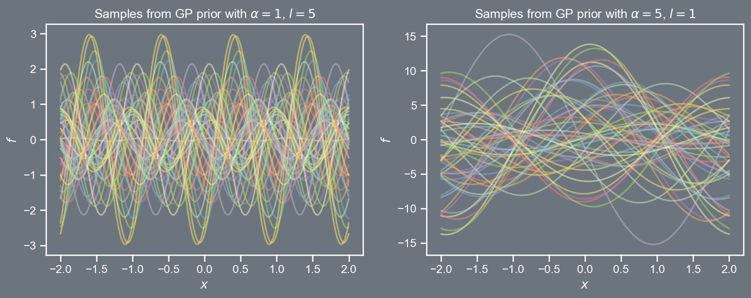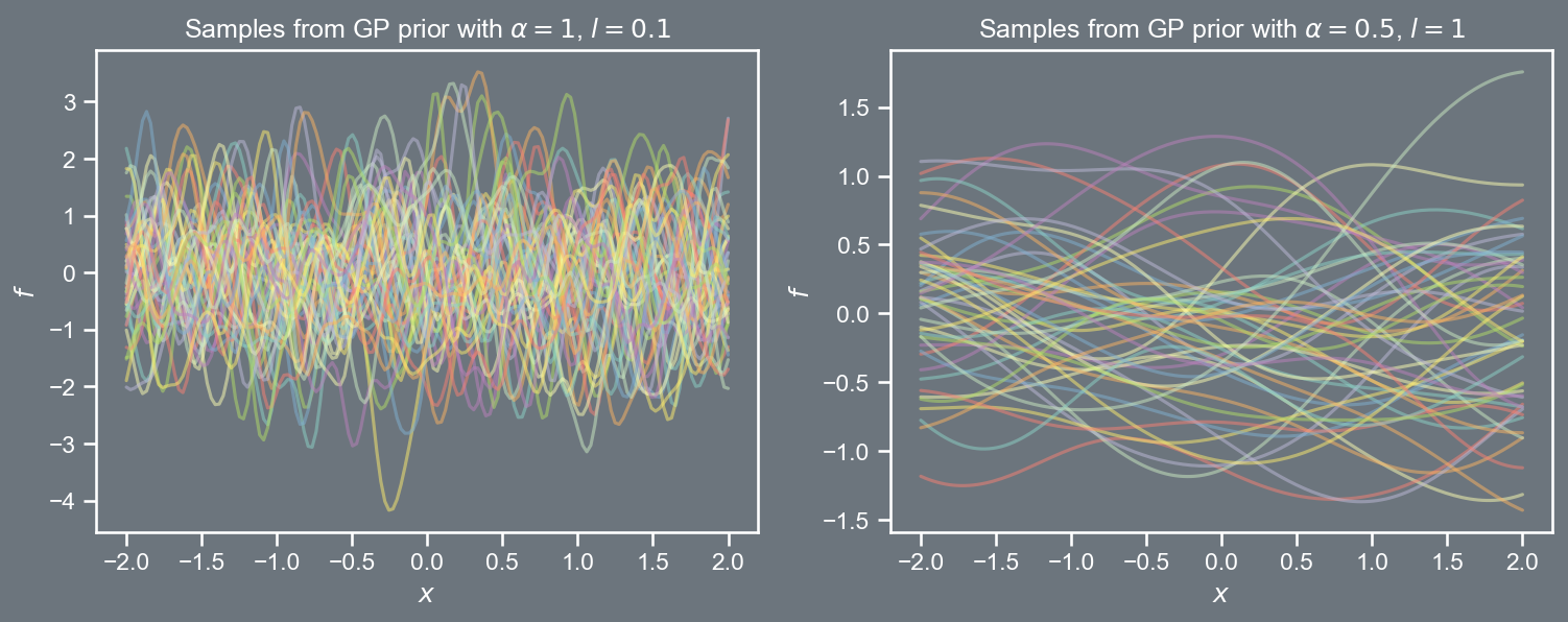import pandas as pdimport numpy as npimport matplotlibimport matplotlib.pyplot as pltfrom scipy.stats import multivariate_normalfrom scipy.linalg import cholesky, solve_triangularimport seaborn as snssns.set(font_scale=1.0)sns.set_style("white")sns.set_style("ticks")palette = sns.color_palette('deep')plt.style.use('dark_background')def kernel(xa, xb, amp, ll): Xa, Xb = get_tiled(xa, xb)return amp**2* np.exp(-0.5*1./ll**2* (Xa - Xb)**2 )def get_tiled(xa, xb): m, n =len(xa), len(xb) xa, xb = xa.reshape(m,1) , xb.reshape(n,1) Xa = np.tile(xa, (1, n)) Xb = np.tile(xb.T, (m, 1))return Xa, XbX = np.linspace(-2, 2, 150)cov_1 = kernel(X, X, 1, 0.1) mu_1 = np.zeros((150,))prior_1 = multivariate_normal(mu_1, cov_1, allow_singular=True)cov_2 = kernel(X, X, 0.5, 1)mu_2 = np.zeros((150,))prior_2 = multivariate_normal(mu_2, cov_2, allow_singular=True)random_samples =50fig, ax = plt.subplots(2, figsize=(12,4))fig.patch.set_facecolor('#6C757D')ax[0].set_fc('#6C757D')plt.subplot(121)plt.plot(X, prior_1.rvs(random_samples).T, alpha=0.5)plt.title(r'Samples from GP prior with $\alpha=1$, $l=0.1$')plt.xlabel(r'$x$')plt.ylabel(r'$f$')#plt.ylabel(r'$\mathbf{w}_1$')fig.patch.set_facecolor('#6C757D')plt.subplot(122)plt.rcParams['axes.facecolor']='#6C757D'ax[1].set_facecolor('#6C757D')plt.plot(X, prior_2.rvs(random_samples).T, alpha=0.5)plt.title(r'Samples from GP prior with $\alpha=0.5$, $l=1$')plt.xlabel(r'$x$')plt.ylabel(r'$f$')plt.savefig('prior.png', dpi=150, bbox_inches='tight', facecolor="#6C757D")plt.close()